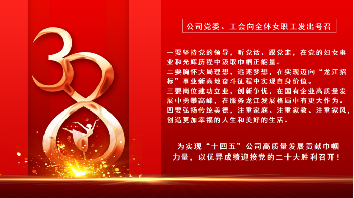 寒雪梅中尽,春风柳上归。在全国两会召开的阵阵喜讯中,我们以饱满热情迈步“龙江im体育运动平台”事业新高地,献礼党的二十大的奋斗之时,“三八国际劳动妇女节”如期而至。公司党委、工会向公司全体女员工致以节日问候!并向长期关心支持你们工作的家属们表示崇高的敬意!借此,也向一直以来关怀公司高质量发展的各界朋友表示衷心的感谢!